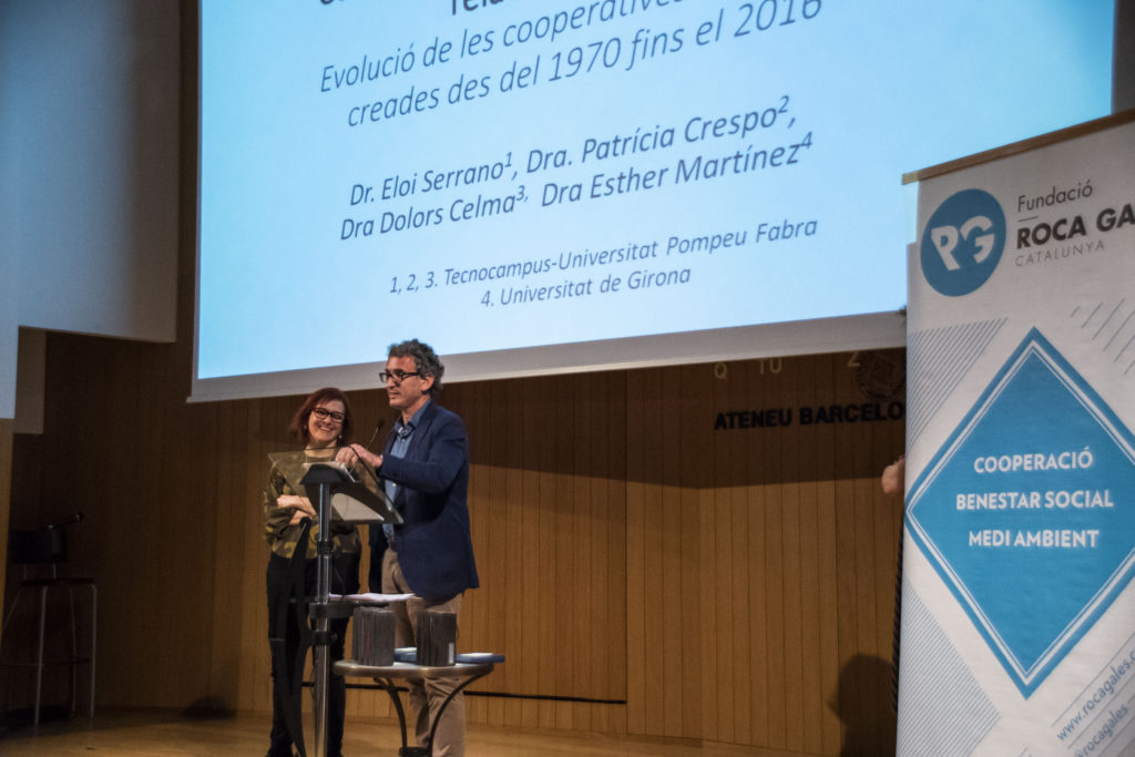 Un cop fetes les presentacions van començar a pujar a l’escenari els protagonistes de la nit. Primer de tot, es va lliurar el premi al millor Cas Pràctic del curs 2016-17 a Neus Sanromà Samper pel seu treball “Relacions laborals en l’àmbit cooperatiu”, i Pablo Garcia Garcia va rebre el premi al millor TFG de la URV pel treball: “Economia social. Las cooperatives de iniciativa social”. Tot seguit, Eloi Serrano i Dolors Celma (Tecnocampus UPF) van presentar la seva investigació: “Cooperatives i crisi econòmica, una relació causal? Evolució de les cooperatives catalanes des de 1970 fins el 2016”. Investigació que han realitzat aquest últim any gràcies a l’ajut concedit per la Fundació Roca Galès i ACCID. Aquest ajut ja ha arribat a la 4ta edició, i aquest any la investigació que es durà a terme serà “Factors d’èxit de les cooperatives centenàries catalanes” a càrrec de Yolanda Montegut i Manel Plana (UdL).